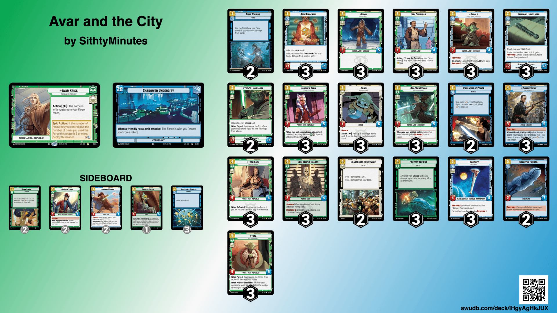 Rotation will come in March with the release of A Lawless Time, and losing some of these more influential leaders will definitely slow the game down a bit more. Looking at the leaders in the graphic above that will survive rotation, Admiral Piett helps to discount Capital Ships, which typically are high cost units to begin with. Sabé can look at the top two cards of her opponent’s deck, discarding one and leaving the other on top, but only after a unit deals damage to the opponent’s base. The Jump To Lightspeed (JTL) Darth Vader can generate TIE Fighters if a non-token vehicle attacked this phase. In all three of these examples, the emphasis is on play styles that come with more restrictions, and can extend games. Even leaders that can bend rules like Sabé need to do it by dealing damage to a base, which can be made difficult with something like a sentinel that forces units to attack them instead of the enemy base. As a player, this makes me excited to revisit other leaders that could put up a good fight, but were generally too slow with faster leaders out in the wild. One example is the Marshall of Starlight, Avar Kriss! Although her leader ability only allows you to generate the Force, a mechanic from an earlier set, when she is deployed she can deal 8 damage and overwhelm a defender to deal excess damage to a base even if a sentinel stands in the way. As a High Republic fan, I would love to see a leader that personifies the era in more competitive events, but we won’t know until we see the first competitive events in March and have more data to compare. In the meantime, this speculation is hype as people look for leaders that they enjoyed playing, but just couldn’t stand up to the gauntlet of objectively stronger leaders. Below you’ll see how the deck is currently structured, but I will be revisiting it when A Lawless Time is released as other cards get revealed that could have an impact on how I want the deck to work. If you’re like me and are interested in exploring Avar Kriss, feel free to use this as a template!