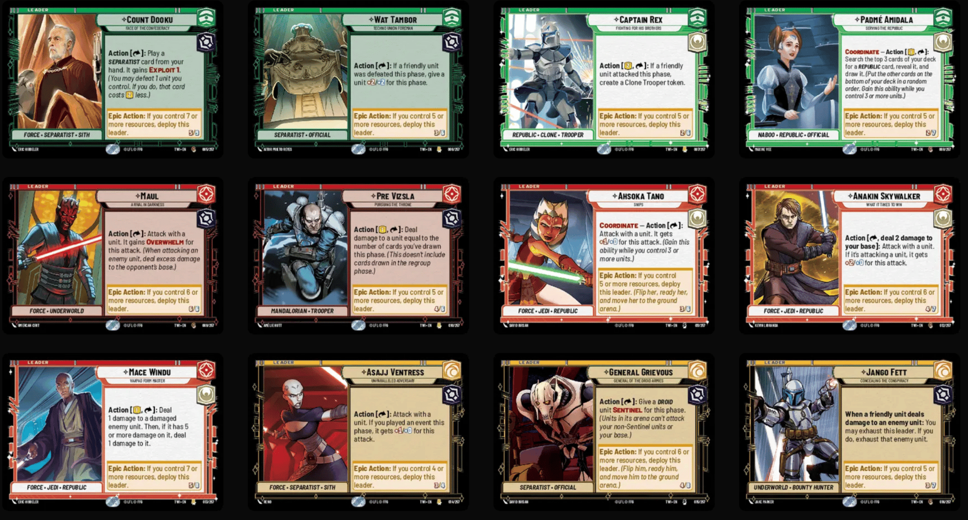 Welcome aboard, Kyber Squadron! As mentioned in the annual update episode, I wanted to use the newsletters as a way to bring more of Star Wars: Unlimited to life and have a more light-hearted conversation alongside the normal topics I tackle on the podcast. Notably, the game will be reaching an important milestone as it will enter its first rotation. For people who do not normally play trading card games, a rotation is when the cards that are allowed at a competitive level change so that older sets are no longer legal for competitive play. In Star Wars: Unlimited, this means the first three sets of cards in the game, Spark of Rebellion, Shadows of the Galaxy, and Twilight of the Republic, will no longer be used in competitive events. Similar to other trading card games, rotation will mean a few key cards will be leaving the game, but Star Wars: Unlimited will also have a major change with leaders being included in that rotation. Since the first set, leaders have set the tone of what a deck wants to do, and as a result they have an outsized influence on the game by design.