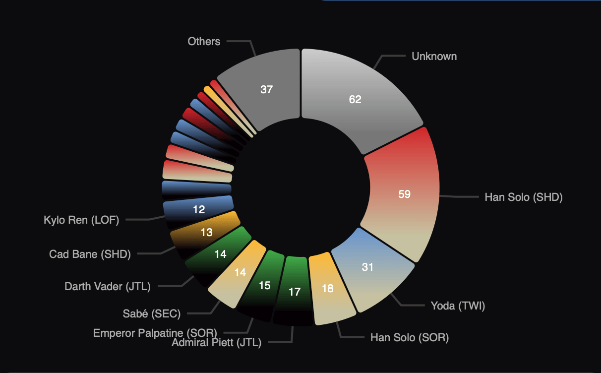 For game designers, rotation is also a way to try and adjust the power levels of the game based on how players have leveraged the existing card pool. From the outset, specific leaders have really taken over the competitive scene because of their abilities to bend the rules of the game. Key examples include the Spark of Rebellion Han Solo leader that allowed players to place an extra resource into play, essentially allowing those players to always be at least one resource above their opponent, meaning they could play larger units or play more cards each turn than their opponent and wear them down that way. Han Solo in Shadows of the Galaxy also has grown into a large threat in the overall ecosystem as he would allow players to play units cheaper in exchange for dealing two damage to them when they enter the battlefield. As more units with larger health entered the game, the damage drawback became less of a drawback, allowing strong units to come in earlier. Rounding out the top leaders in current competitive circles is Yoda from Twilight of the Republic. Yoda works by allowing a player to look at the top card of their deck, and then place one card in their hand either on the top or bottom of their deck, allowing players to get access to cards earlier, and to ensure good cards are quickly drawn back into their hand, or cards that are ineffective against an opponent can go on the bottom of a deck. Although other leaders have had flashes of inspiration or dominance, those three from the first three sets have really come into their own in the game’s first year, and their ability to consistently stay near the top of each tournament highlights how influential they have been in the game. To emphasize this point, below is the breakdown of leaders used at the most recent Sector Qualifier, an event with 342 players